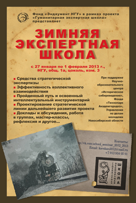 В рамках проекта «Гуманитарная экспертная школа» в Новосибирском государственном университете состоится Зимняя экспертная школа. Школа проводится при поддержке Научно-образовательного центра «Историческое сибиреведение», Фонда «Эндаумент НГУ», Фонда «Технопарк Академгородска», Управления по делам молодежи Новосибирской области.