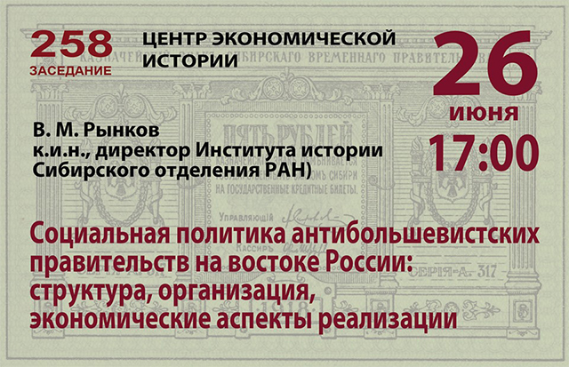8 июля 201926 июня 2019 г. состоялось 258 заседание семинара Центра экономической истории Исторического факультета Московского государственного университета. С докладом «Социальная политика антибольшевистских правительств на востоке России: структура, организация, экономические аспекты реализации» выступил директор Института истории СО РАН Вадим Маркович Рынков. Докладчик проанализировал деятельность органов власти и управления Поволжья, Сибири и Дальнего Востока в период борьбы с большевиками. Основная идея доклада — внутреннюю политику восточной контрреволюции с полным правом можно охарактеризовать как социально ориентированную. Решение социальных проблем занимало в ней важнейшее место после обеспечения армии. Гражданская война стала масштабной социальной катастрофой. Численность групп населения, нуждавшейся в социальной поддержке со стороны власти, кардинально возросла. Антибольшевистские правительства не только считали действующими все социальные обязательства, принятые государственной властью до октября 1917 года, но и активно адаптировали их к изменявшимся обстоятельствам военного и идеологического противостояния. Основной акцент был сделан на использование правовых и экономических рычагов государственного регулирования, административные оказались задействованы в меньшей степени. Власть несла бремя высоких социальных расходов, что позволило населению на востоке России легче адаптироваться к условиям Гражданской войны. Но такая политика препятствовала концентрации финансовых и административных ресурсов на военные нужды и в значительной мере предопределила поражение в вооруженной борьбе.