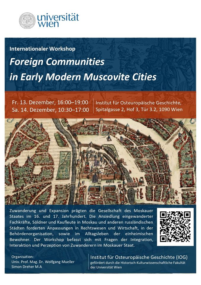 13-14 декабря 2019 года научный сотрудник ИИ СО РАН И.Р. Соколовский принял участие в Workshop "Foreign Communities in Early Modern Muscovite Cities", проводимого университетом Вены (Австрия).