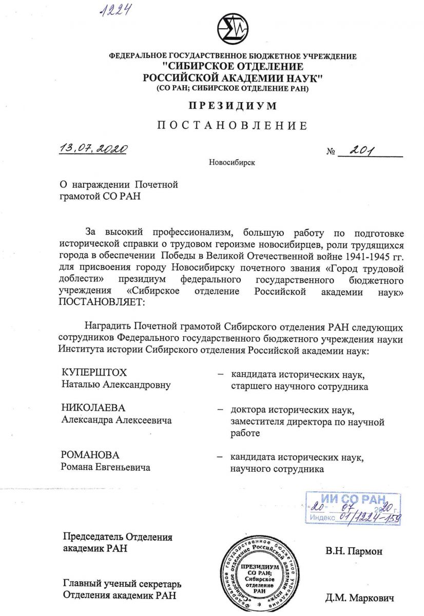 Сотрудники института награждены Почетными грамотами СО РАН.
