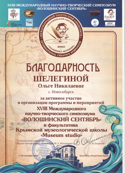 15 октября 202014–20 сентября 2020 г. ведущий научный сотрудник сектора музей СО РАН Института истории СО РАН, д-р ист. наук Ольга Николаевна Шелегина приняла участие в XVIII Международном научно-творческом симпозиуме «Волошинский сентябрь». Она выступила с пленарным докладом «Средовые музеи: общие тенденции и региональные особенности». В рамках факультативного занятия Крымской музеологической школы была представлена монография О.Н. Шелегиной «Музейный мир Сибири в первые десятилетия XXI века».