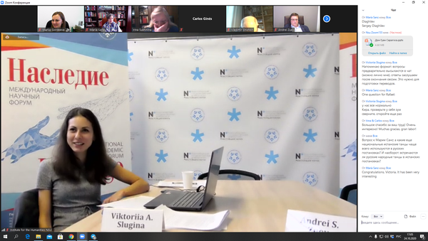 Научный сотрудник сектора археографии и источниковедения Виктория Александровна Слугина представила доклад: «Договоры и присяги на верность: испанский и российской способ колонизации в XVII в. / Treaties and oaths of allegiance: Spanish and Russian way of colonization in the 17th century». В.А. Слугина провела сравнительный анализ испанской практики заключения договоров с арауканами (мапуче) в XVII в., с аналогичными практиками приведения в подданство народов Сибири на верность российскому монарху в XVII в. Доклад вызвал активное обсуждение участниками конференции.