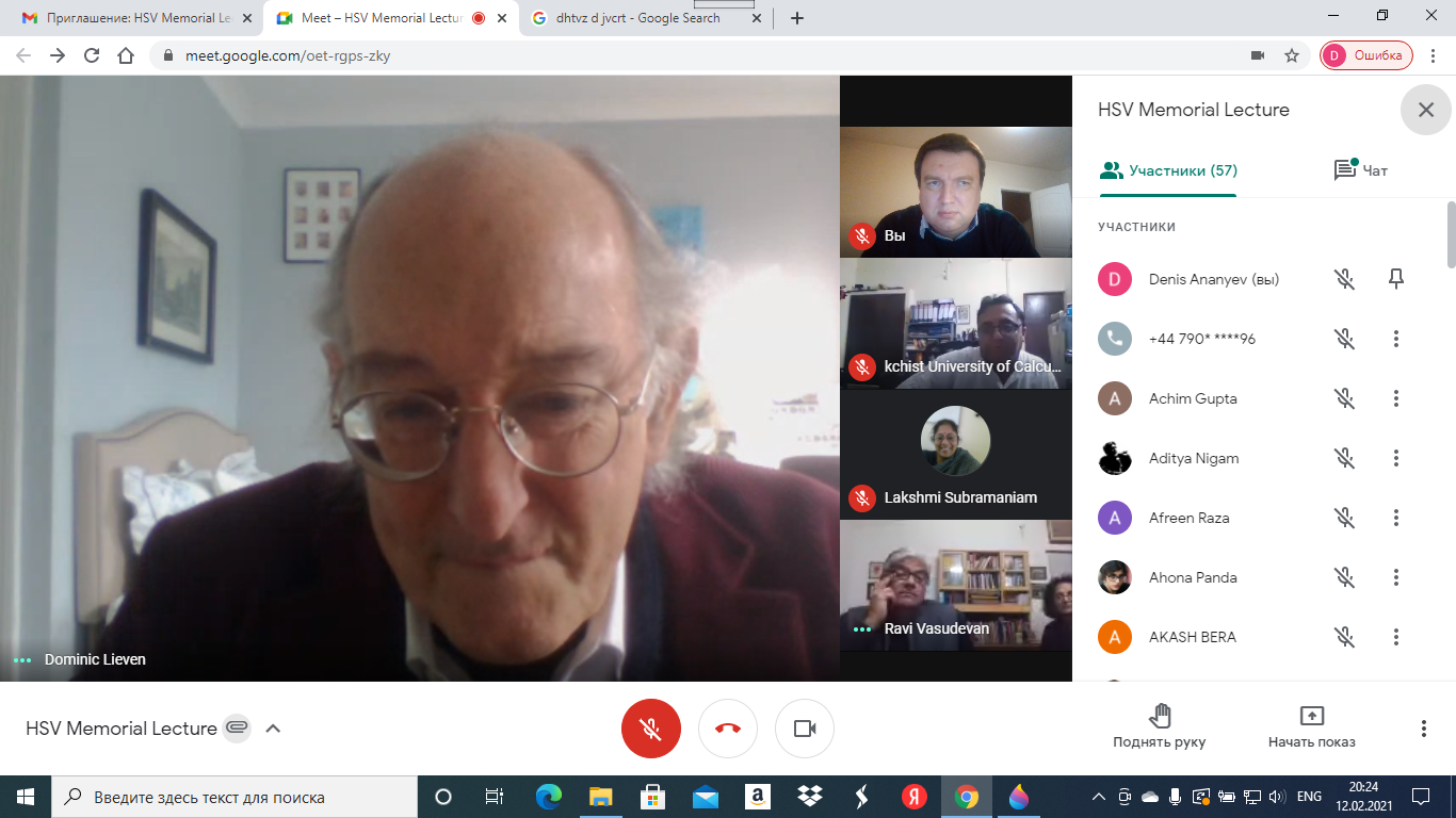 16 февраля 202112 февраля 2021 г. по приглашению департамента истории Калькуттского университета (г. Калькутта, Индия) старший научный сотрудник Института истории СО РАН. канд. ист. наук Денис Анатольевич Ананьев принял участие в памятном мероприятии, организованном в режиме online и посвященном бывшему сотруднику университета, известному индийскому историку, профессору Хари Васудевану (1952-2020), ушедшему из жизни в мае 2020 г.