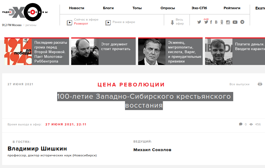 29 июня 202127 июня 2021 г. на радиостанции «Эхо Москвы» вышел очередной выпуск программы «Цена революции», посвященный Западно-Сибирскому восстанию 1921 года.