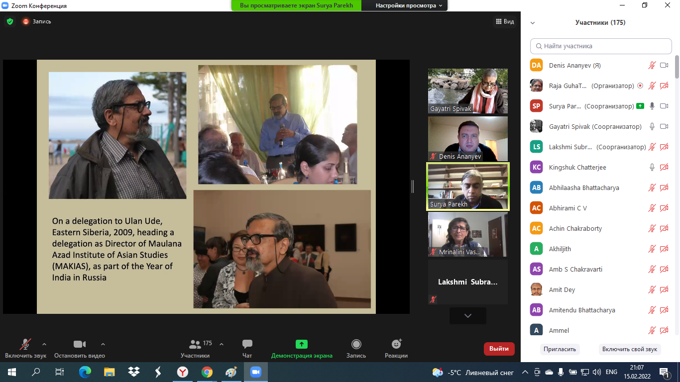 24 февраля 2022Старший научный сотрудник Института истории СО РАН канд. ист. наук Денис Анатольевич Ананьев принял участие в ежегодном online-мероприятии, посвященном памяти выдающегося индийского историка-русиста Хари Санкара Васудевана (1952–2020), в 2007–2011 гг. – директора Института азиатских исследований им. М.А.К. Азада (Калькутта, Индия).