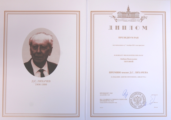 9 сентября 2022В Президиуме Сибирского отделения Российской академии наук 1 сентября 2022 г. состоялось торжественное заседание с участием Президента Российской академии наук Александра Михайловича Сергеева. На этом заседании старшему научному сотруднику сектора археографии и источниковедения Института истории СО РАН, канд. филол. наук Любови Васильевне Титовой вручен диплом Президиума РАН и премия имени Д.С. Лихачева 2021 года за издание книги «Житие протопопа Аввакума» в серии «Литературные памятники».