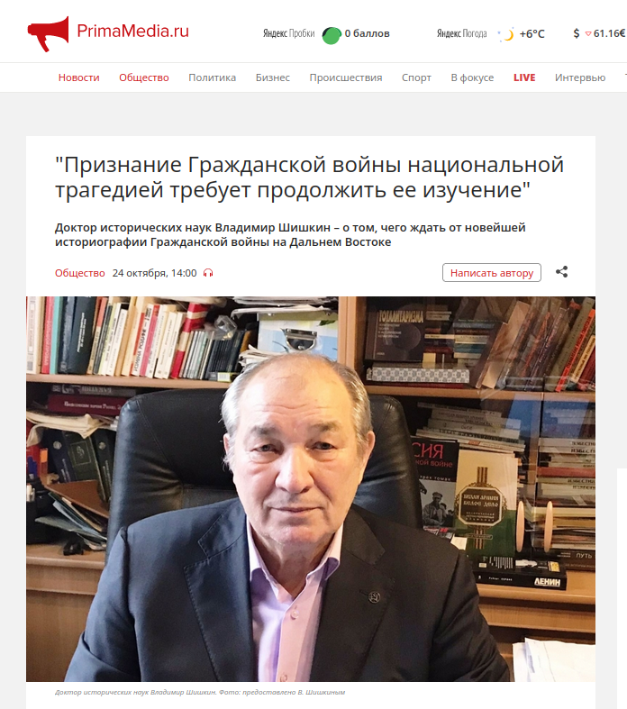 Сотрудник Института истории СО РАН В.И. Шишкин дал интервью информационному агенству PrimaMedia в преддверии конференции «Гражданская война на Дальнем Востоке: окончание, итоги, последствия»