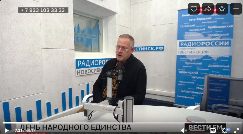 3 ноября 2022Исторические корни праздника и актуальные общественные проблемы в канун Дня народного единства обсудили 3 ноября 2022 года в прямом эфире программы «Есть мнение» радиостанции «Вести FM Новосибирск» ведущие Петр Уваров и Сергей Санников и научный сотрудник Института истории СО РАН, канд. ист. наук В.В. Журавлев.