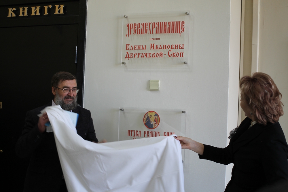 Знаковым событием стало открытие памятной доски в Отделе рукописей и редких книг ГПНТБ – «Древлехранилище имени Елены Ивановны Дергачёвой-Скоп». Собиранию на территории Сибири уникальной коллекции книжных памятников Елена Ивановна посвятила всю жизнь. Большой заслугой её научно-педагогической деятельности стала подготовка специалистов по археографии и источниковедению, продолжающих её дело.