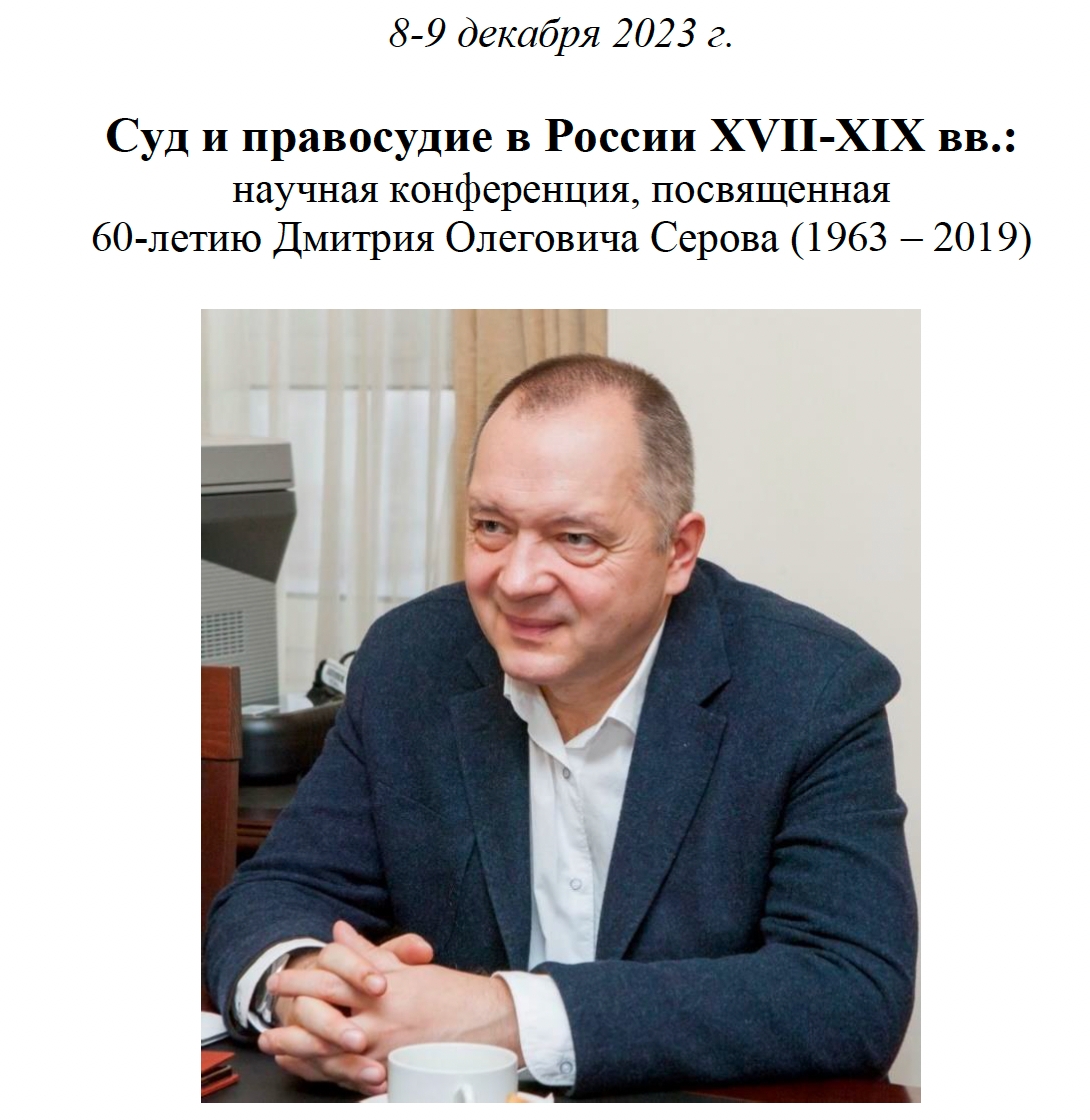 8–9 декабря 2023 г. Центр истории Нового времени Школы исторических наук Высшей школы экономики провел Международную научную конференцию «Суд и правосудие в России в XVII – XIX вв.» посвященную 60-летию Дмитрия Олеговича Серова - доктора исторических наук, специалиста в области истории государства и права России XVIII-XX вв., известного исследователя истории Петровского времени, истории судебных и следственных органов России, нашего земляка, ушедшего из жизни четыре года назад, до конца жизни воглавлявшего кафедру теории и истории государства и права Новосибирского государственного университета экономики и управления.