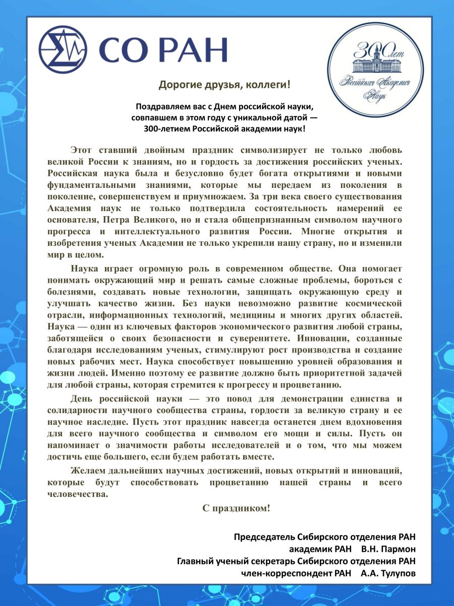 Поздравление председателя Сибирского отделения Российской академии наук академика РАН В.Н. Пармона с Днем российской науки