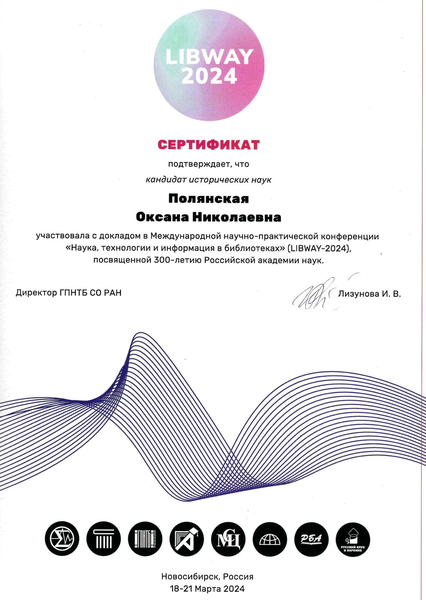 21 марта 2024Старший научный сотрудник сектора история второй половины XVI – начала XX в. кандидат исторических наук Оксана Николаевна Полянская приняла участие в работе Международной научно-практической конференции LIBWAY‑2024: «Наука, технологии и информация в библиотеках», которая проходила с 18 по 21 марта 2024 г. (Новосибирск-Бердск). Конференция – ежегодное мероприятие, проводимое Государственной публичной научно-технической библиотекой СО РАН. Среди докладчиков – специалисты из России, Белоруси, Кыргызстана, Китая, Индии, Турции, Малайзии, Намибии, Иордании и Республики Корея.