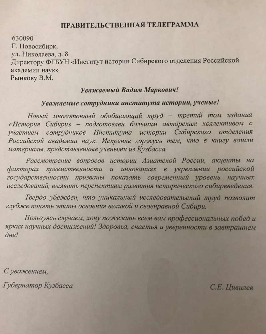В адрес Института истории СО РАН, на имя директора В.М. Рынкова пришла поздравительная телеграмма от губернатора Кузбасса С.Е. Цивилива.