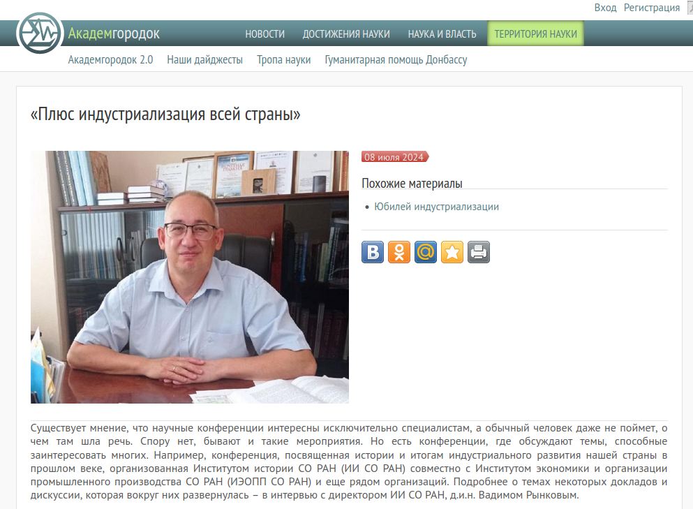 Интервью директора Института истории СО РАН В.М. Рынкова корреспонденту портала «Академгородок» Сергею Исаеву о недавно проведенной Всероссийской научной конференции «Индустриальное развитие России: этапы, особенности, перспективы изучения»