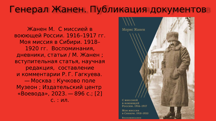 - М. Жанен «С миссией в воюющей России. 1916–1917 гг. Моя миссия в Сибири. 1918–1920 гг. Воспоминания, дневники, статьи»;