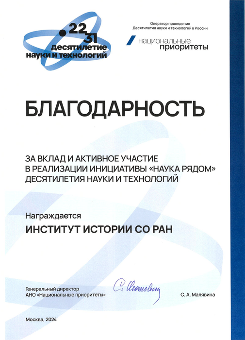 Благодарность за вклад в реализацию инициативы «Наука рядом» Десятилетия науки и технологий в России объявлена Институту истории СО РАН
