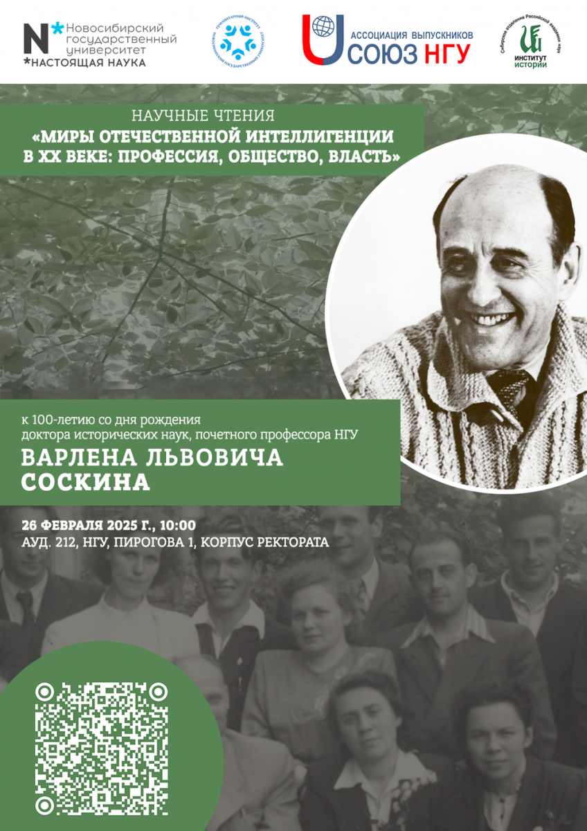 17 февраля 202526 февраля 2025 г. в 10:00 в ауд. 212 (НГУ, Пирогова 1, корпус ректората) состоятся Научные чтения «Миры отечественной интеллигенции в XX веке: профессия, общество, власть», посвященные 100-летию со дня рождения доктора исторических наук, профессора, заслуженного деятеля науки РФ, почетного профессора Новосибирского государственного университета Варлена Львовича Соскина.
