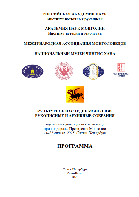 23 апреля 202521−22 апреля в Санкт-Петербурге состоялась Седьмая международная научная конференция «Культурное наследие монголов: рукописные и архивные собрания». Организаторами конференции выступили Институт восточных рукописей Российской академии наук и Институт истории и этнологии Академии наук Монголии, Международная ассоциация монголоведов и Национальный музей Чингис-Хана.