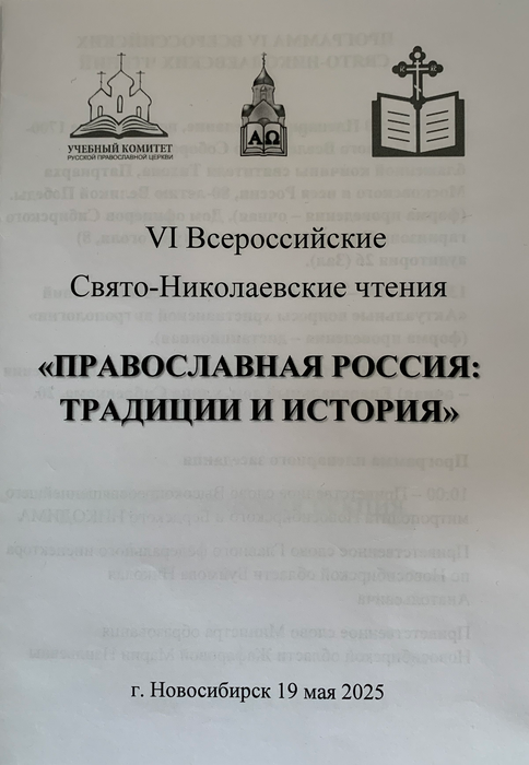 В Новосибирске 19 мая 2025 года прошли Шестые Всероссийские Свято‑Николаевские чтения «Православная Россия: традиции и история». Организаторами всероссийской научно-практической конференции выступили Учебный комитет Русской православной церкви, Новосибирская митрополия Русской православной церкви, Новосибирская православная духовная семинария. Участников конференции из Москвы, Минска (Беларусь), Новосибирска, Пензы и Санкт‑Петербурга приветствовали митрополит Новосибирский и Бердский Никодим и главный федеральный инспектор по Новосибирской области Н.А. Буймов. Научный форум прошел в смешанном очном и дистанционном формате.
