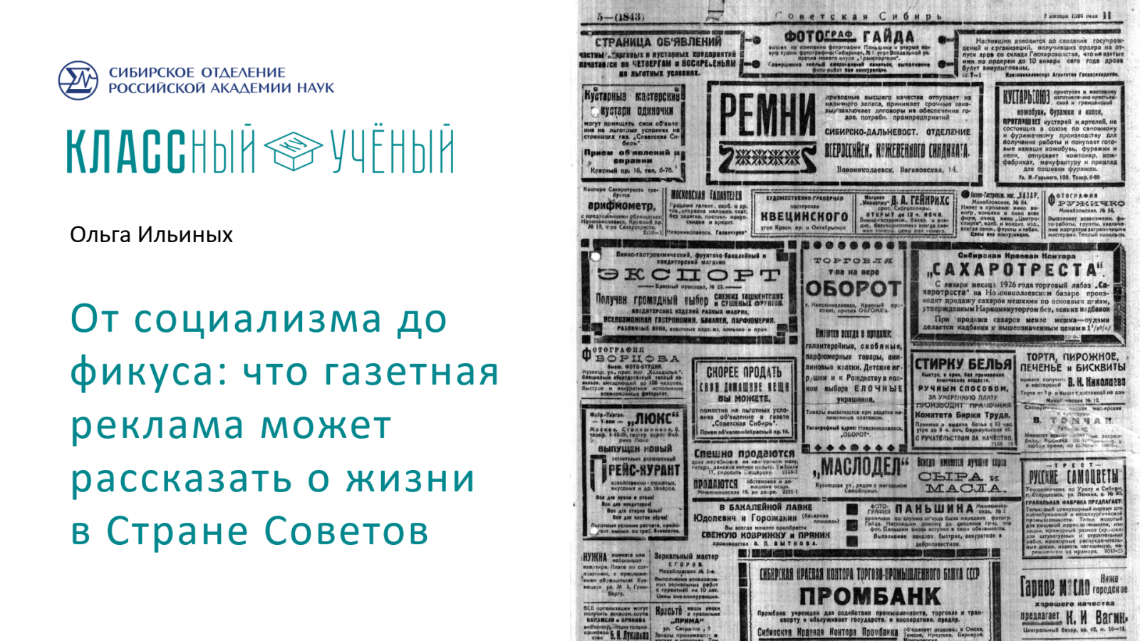 16 июня 2025Младший научный сотрудник сектора истории социально-экономического развития Института истории СО РАН Ольга Владимировна Ильиных выступила с научно‑популярной лекцией «От социализма до фикуса: что газетная реклама может рассказать о жизни в Стране Советов» в рамках проекта «КЛАССный ученый», организуемого Советом научной молодежи СО РАН.