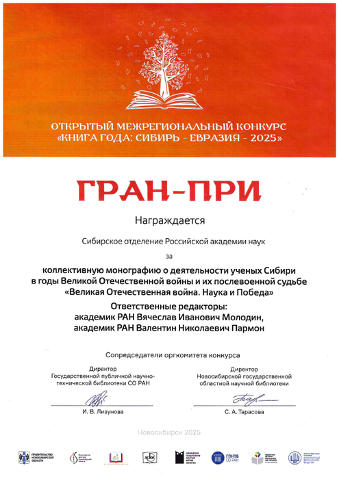 Сибирское отделение Российской академии наук за коллективную монографию о деятельности ученых Сибири в годы Великой Отечественной войны и их послевоенной судьбе «Великая Отечественная война. Наука и Победа» (Новосибирск, 2025) получило гран-при Межрегионального конкурса «Книга года: Сибирь−Евразия−2025».