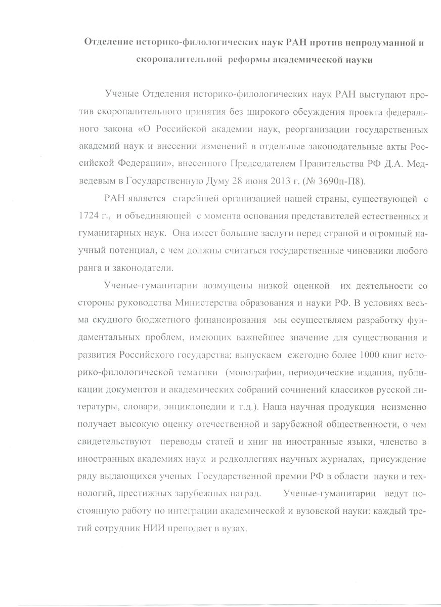 2 июля 2013Ученые Отделения историко-филологических наук РАН выступают против скоропалительного принятия без широкого обсуждения проекта федерального закона «О Российской академии наук, реорганизации государственных академий наук и внесении изменений в отдельные законодательные акты Российской Федерации», внесенного Председателем Правительства РФ Д.А. Медведевым в Государственную Думу 28 июня 2013 г. (№ 3690п-П8).