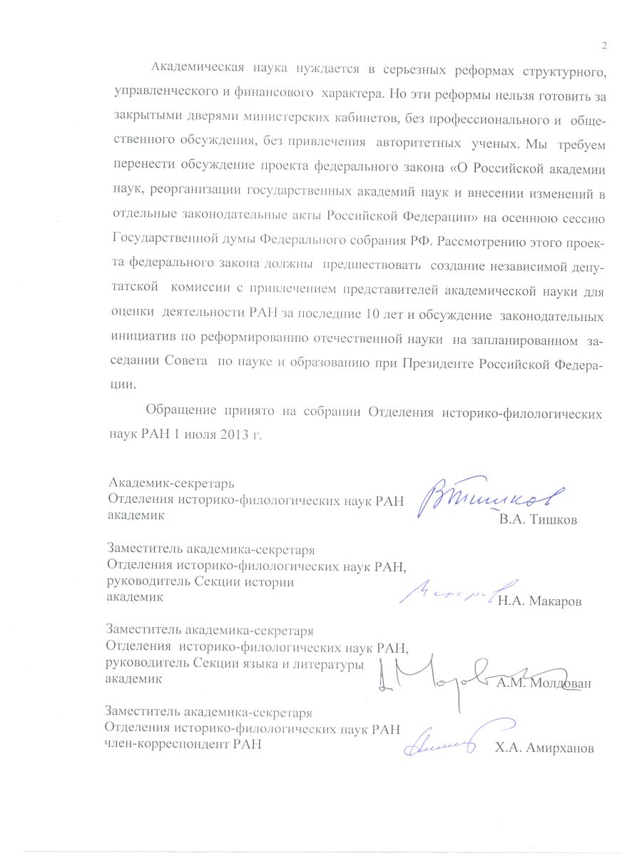 Обращение принято на собрании Отделения историко-филологических наук РАН 1 июля 2013 г.