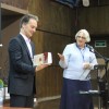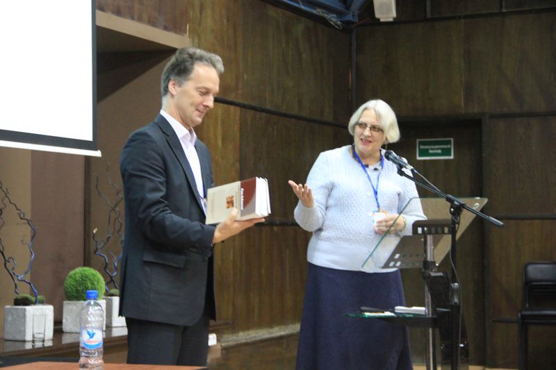 Фото 6. Е.А. Воронцова – к.и.н., с.н.с., заведующая сектором издательских проектов Государственного литературного музея, выступившая с пленарным докладом «Музеи-библиотеки – архивы в эпоху противоборства глобализации, глокализации, антиглобализма», вручает новые издания к.и.н., заместителю директора по научной и библиотечной работе Новосибирской областной научной библиотеки В.Г. Дееву.